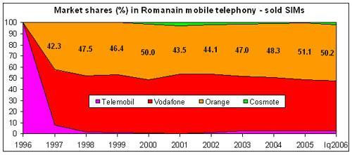 is currently the market leader in Romanian mobile telephony by sold SIMs (7.1 million SIMs sold within a 14.1 million market), as well as by turnover - $239 million in 1Q06, $870 million in 2005.